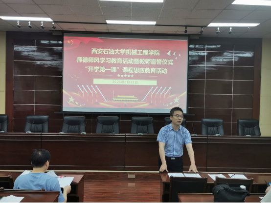 为热烈庆祝中国共产党成立100周年,全面落实习近平总书记在党史学习教育动员大会上的重要讲话精神,按照bat365中文官方网站《关于2021学年秋季学期开展“开学第一课”课程思政教育活动的通知》的相关要求,8月31日下午,机械工程学院在雁塔校区第五会议室开展“开学第一课”课程思政观摩学习活动。机械工程学院党委书记蔡建文、院长窦益华及学院全体教职工参加了学习活动。