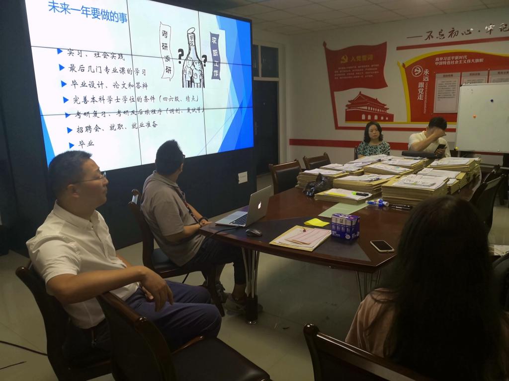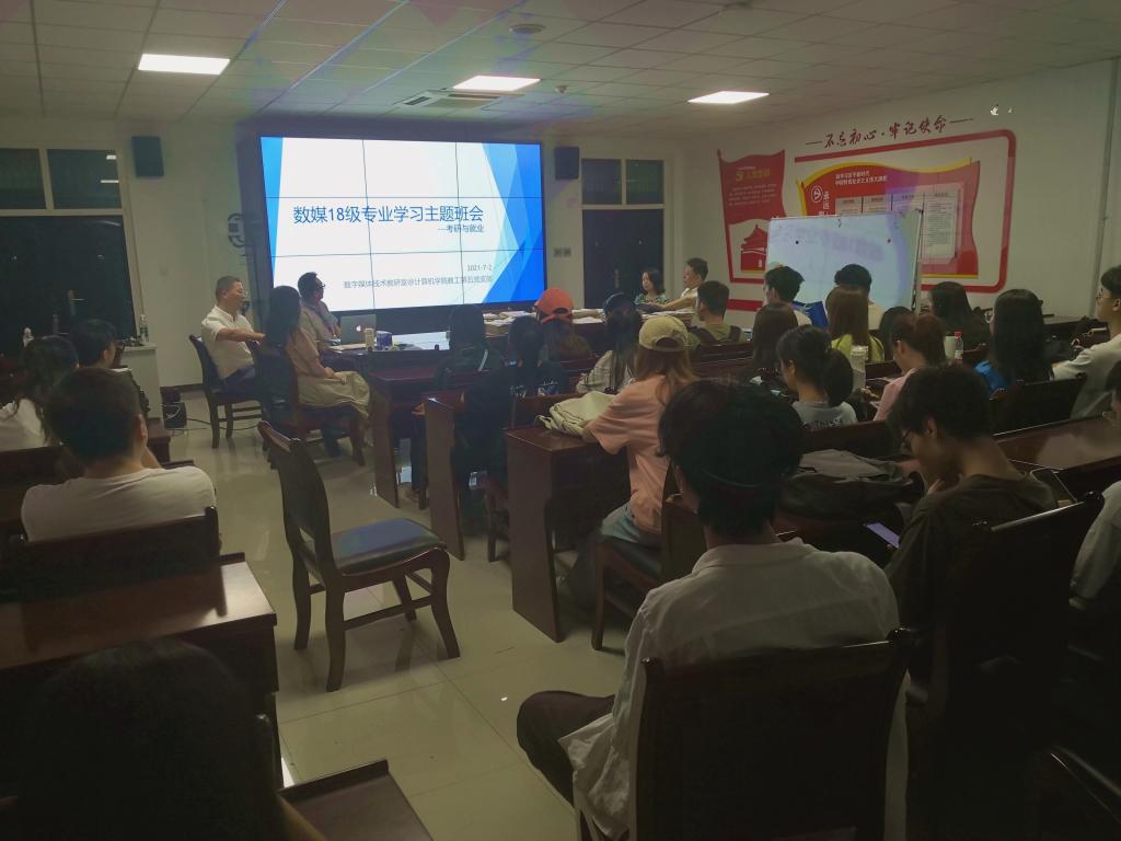 为帮助学生进一步认清考研与就业形势,为即将到来的四年级学习和生活做好准备,7月2日,在鄠邑校区C1楼112会议室,计算机学院教工第五党支部组织部分教师党员召开了“考研与就业”主题班会。学院党委委员、数字媒体系主任杨文阳、教师党员代表吉喆、何志州、赵越、李湘眷、崔惠萍和2018级数字媒体技术专业全体学生参加了本次班会。