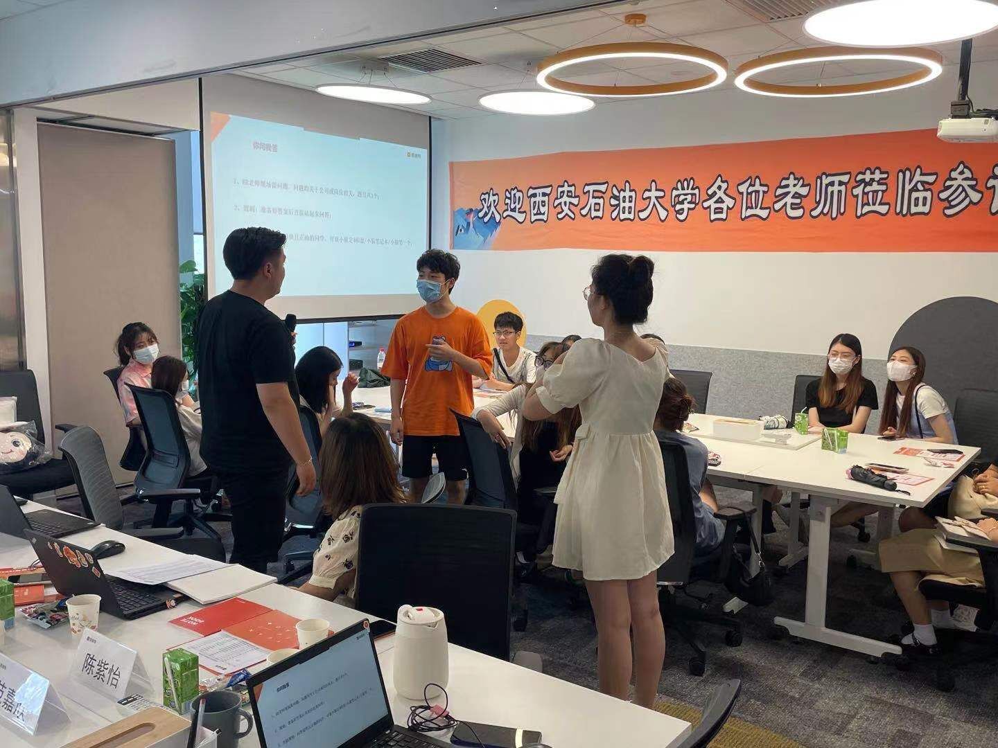 为了提升学生的求职积极性,增加学生对就业市场的了解,6月28日下午,人文学院党委副书记盛丹和2018级辅导员范嘉欣老师带领2018级四十余位来自中文、视觉传达设计、环境设计专业的学生到西安猿辅导公司进行参观学习。