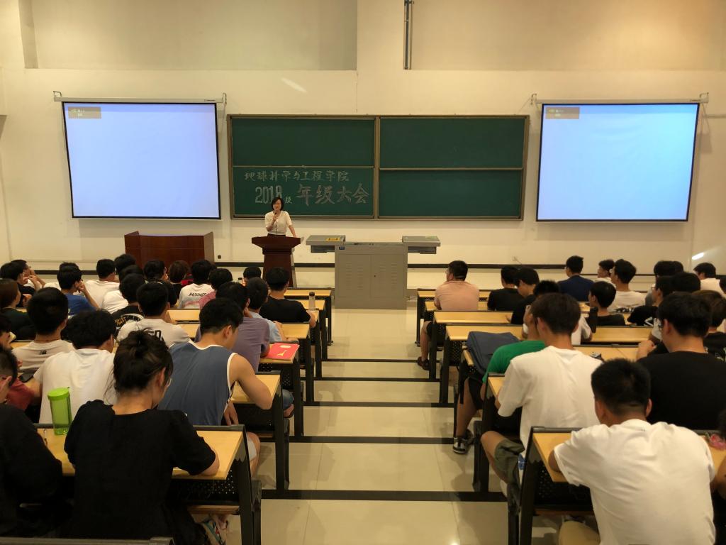 6月27日下午,地球科学与工程学院在石工地科楼115教室举行2018级主题年级大会。学院党委副书记王莹、学工办主任李化杰参加年级大会。会议由辅导员李佩琦老师主持,2018级全体同学参加大会。