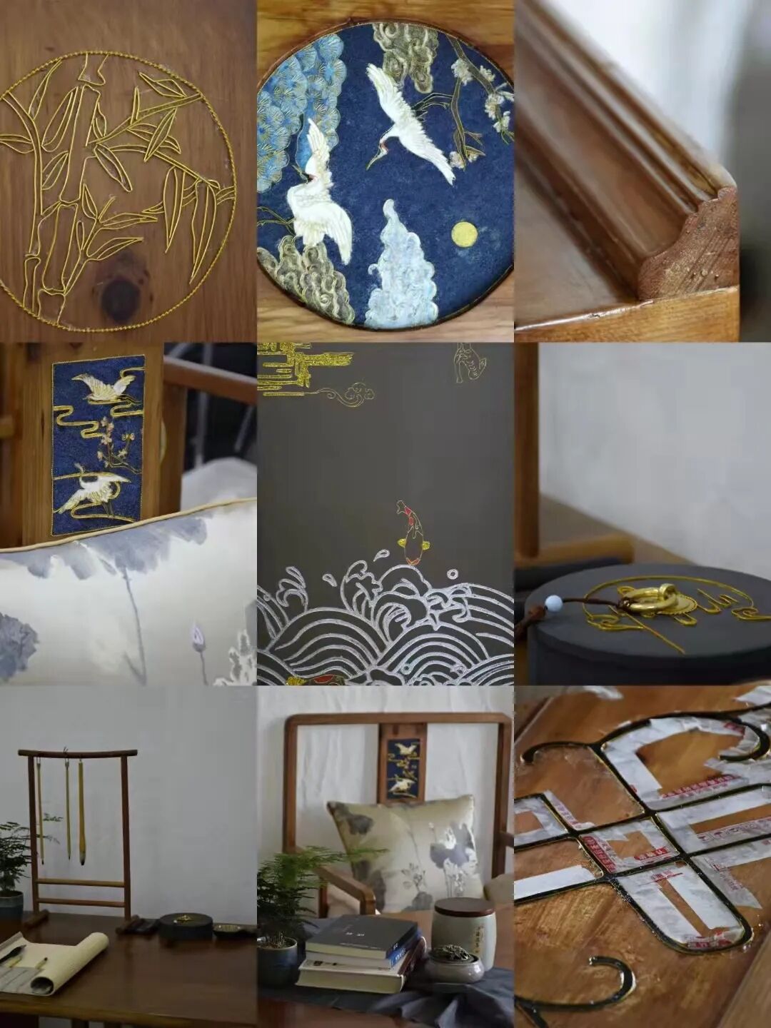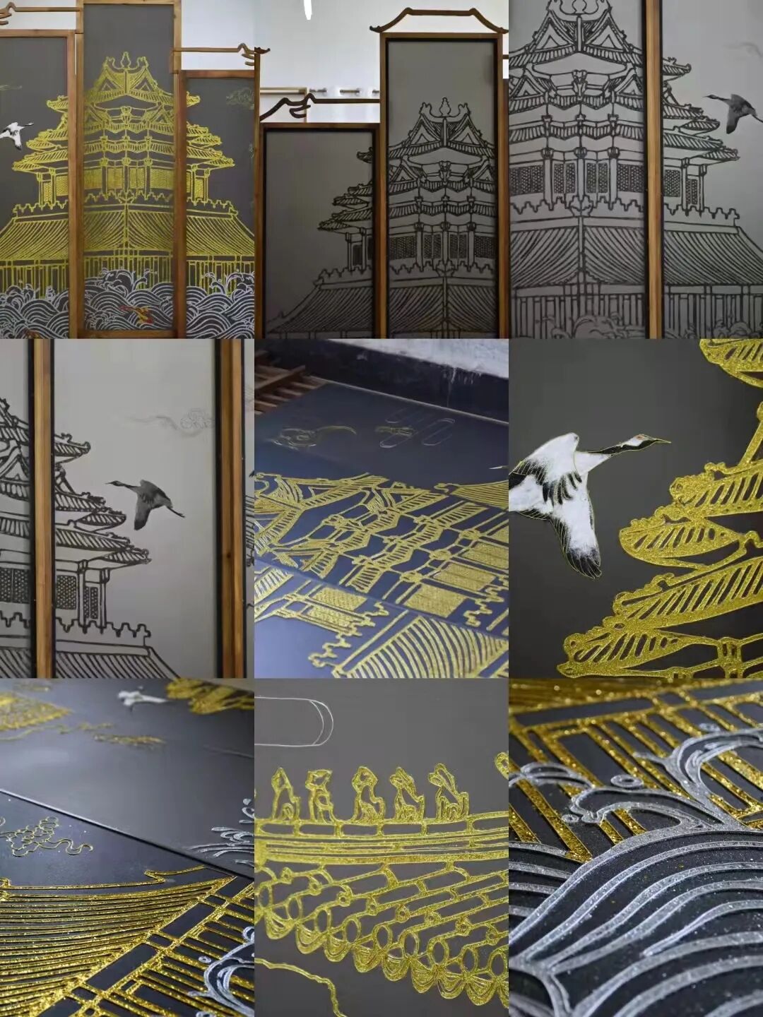 其一,大家了解的景泰蓝就是铜胎掐丝珐琅,其原理是一种在铜质胎体上用柔软的扁铜丝,掐成各种花纹焊上,然后把珐琅质的色釉填充在花纹内烧制而成的器物。但要是以木质家具为胎体进行掐丝珐琅就不能进行烧制了,因而采用传统热工艺的现代改良法冷工艺进行尝试,直接在已经涂饰过的家具表面进行手工掐丝,然后填色,局部还会使用环氧树脂胶进行表面封层,最终形成展品中不仅木质家具表面,甚至在轻薄的屏风上,仿佛金线缠绕实则掐丝镶嵌,一折一直都显得立体生动,仙鹤更是有翩翩欲飞之意。