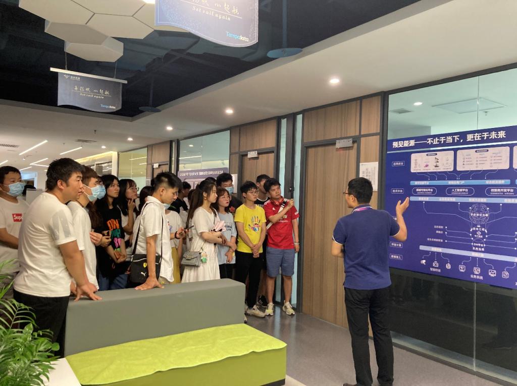 随后,公司区域总监杨东涛带领大家参观了美林数据的科技展厅,杨总监引用习近平总书记的话“推进互联网、大数据、人工智能同实体经济深度融合,推进制造业产业模式和企业形态根本性转变,促进我国产业迈向全球价值链中高端”,进一步向同学们说明了大数据发展的重要性和必要性,并就“如何通过技术和能力提升自己”与同学们进行了交流探讨。