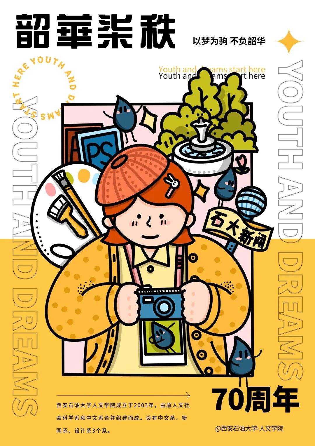 作品的小巧思还在于用各院系特有的学习或工作工具、符号来体现院系独特风格,如人文学院卡通形象手拿相机,后附调色盘与话筒,生动活泼地表现出了人文院学生浓厚的人文艺术气息。