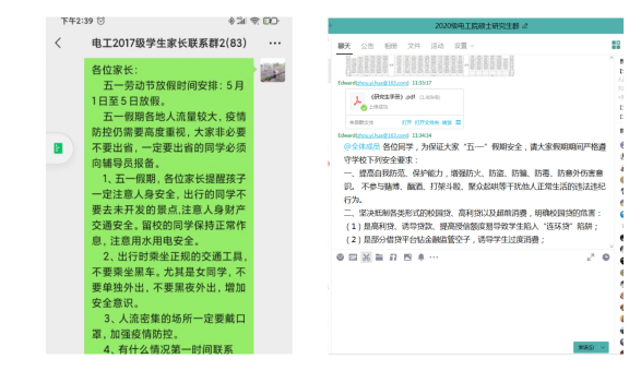 三是学院各年级通过学生QQ群、微信群、公众号等形式,进行线上安全教育和校纪校规教育,希望同学们在校期间严格要求自己,筑牢“三个红线”底线意识,在校期间一不参与任何形式打架斗殴、二不以任何形式考试作弊、三不在宿舍使用违禁电器。