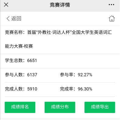此次大赛全程采用线上竞赛模式,设置多种词汇题型,随机出题,竞赛平台综合学生答题分数和答题时间进行排名。本次参赛学生以2019级和2020级学生为主,在线注册6651人,共计6137人参加,5910人完成比赛,参与率为92.27%,完成率为96.30%。校赛成绩排名前200的学生直接晋级省赛,由平台直接推送复赛邀请给晋级学生。按照我院大学英语的教学安排,此次参赛同学记大学英语课外实践分2分。