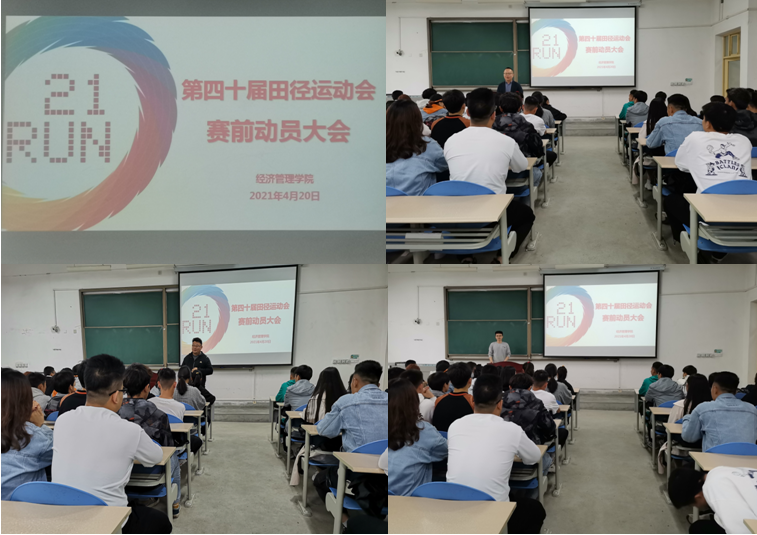为进一步做好第四十届田径运动会各项准备工作,充分调动学院运动员参赛的拼搏精神和竞赛精神,经济管理学院于4月20日下午在博思楼104教室召开运动会赛前动员大会。学院党委副书记王刚、学院学生管理办公室主任刘冰出席会议并做动员,会议由学生会指导老师史阳主持。