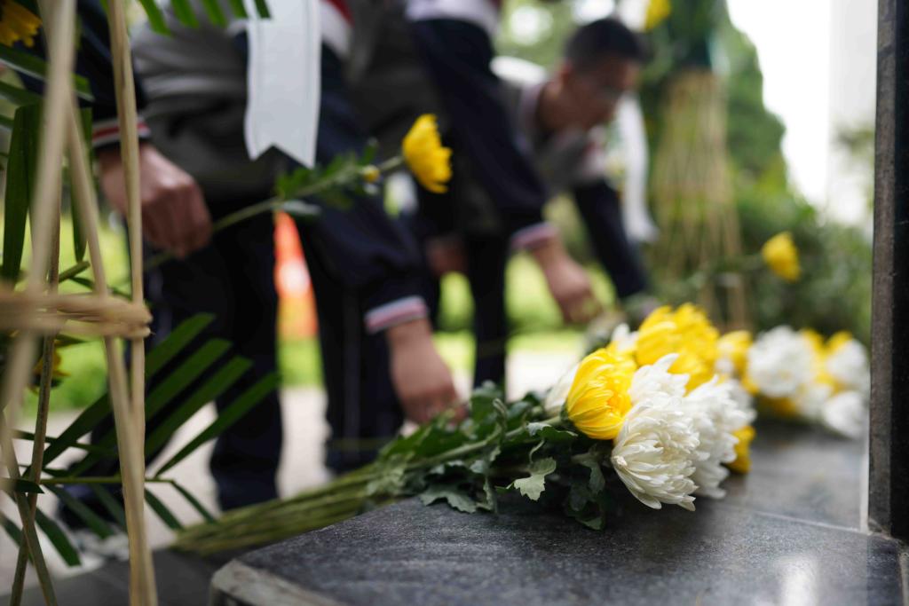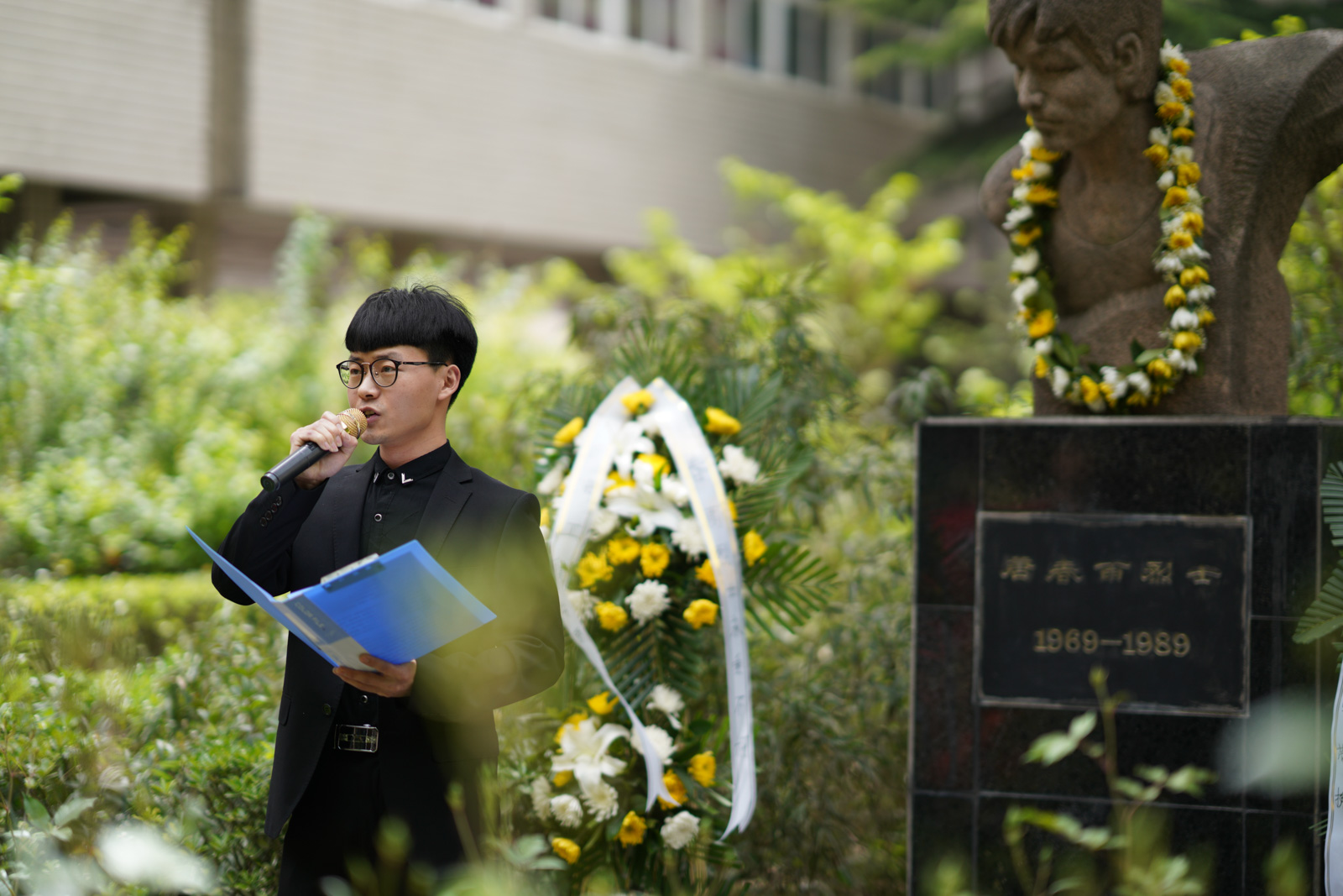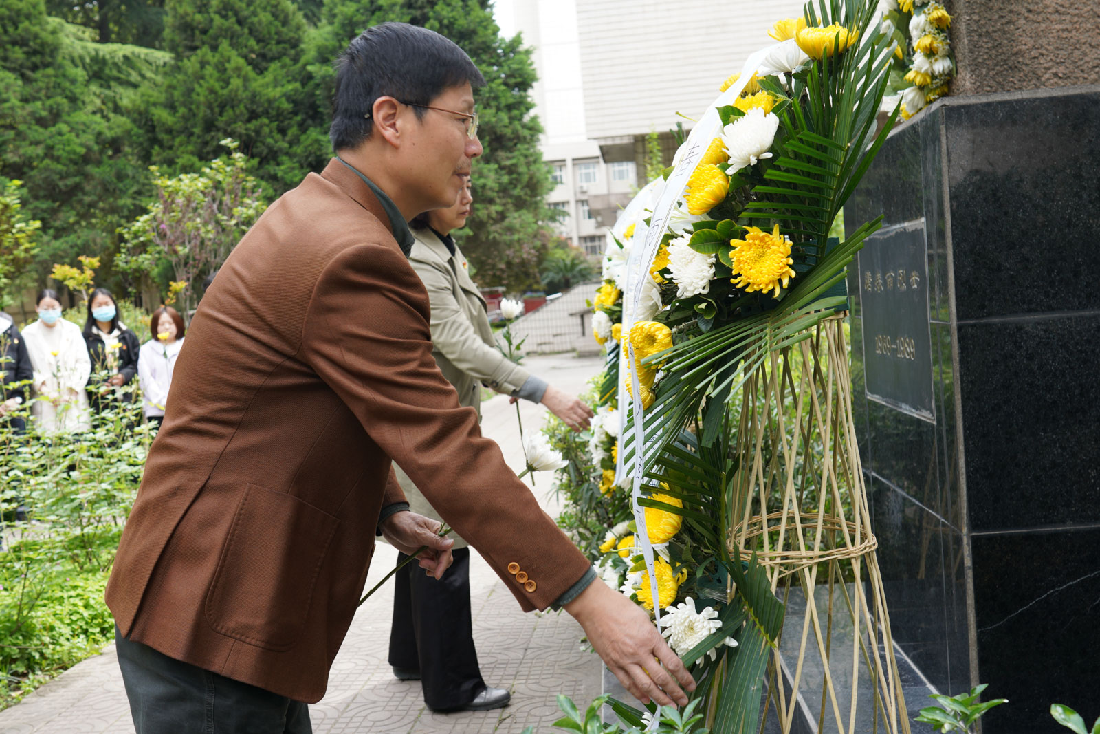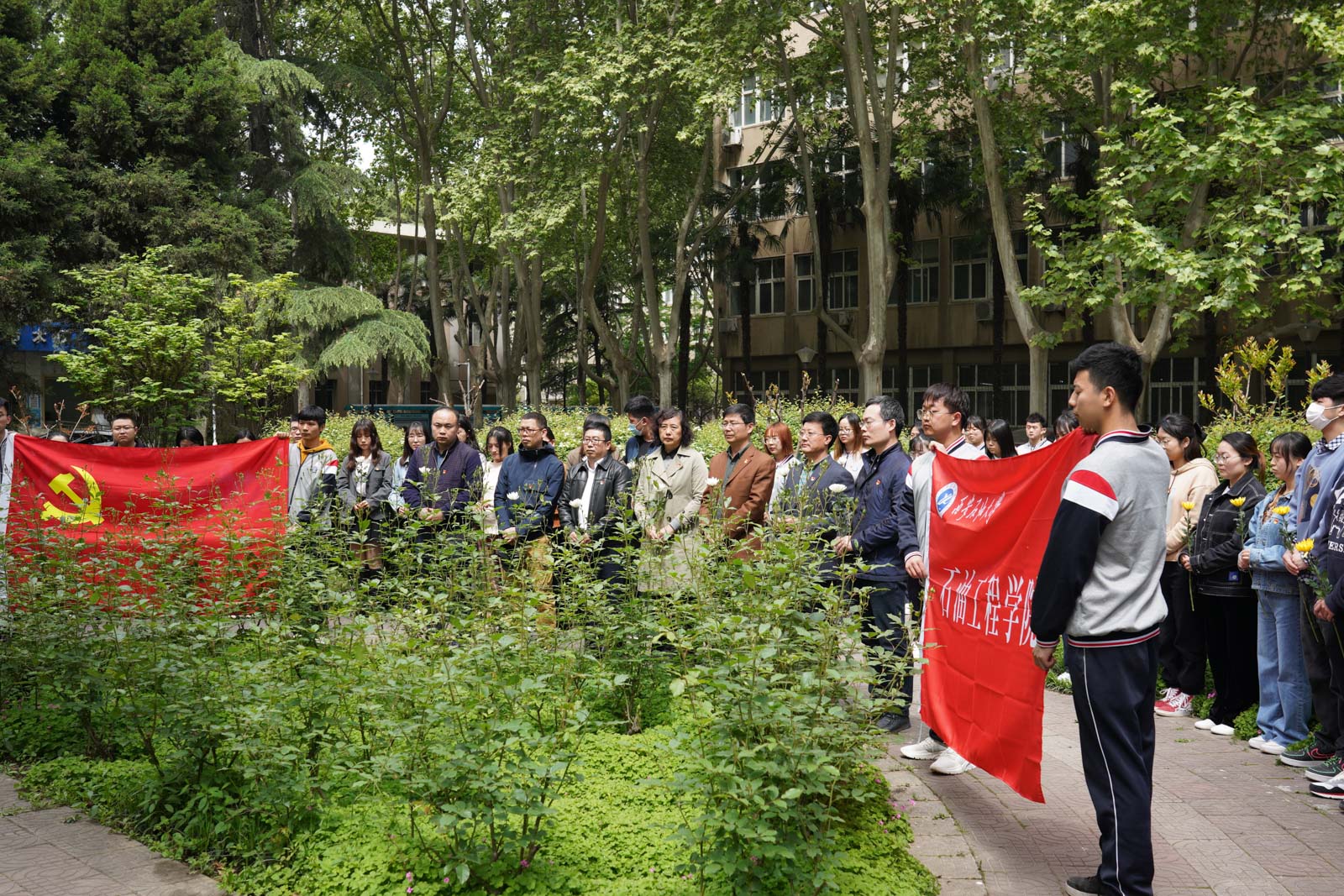 悼念活动在低沉的献花曲中展开,主持人为同志们详细介绍了唐春雨烈士的英雄事迹,研究生工作部部长高荣芳、石油工程学院党委书记马勇仔细整理花篮绸带,深切缅怀春雨烈士。