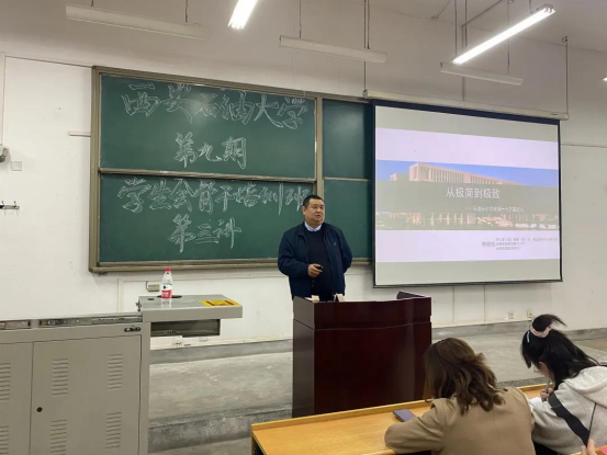 4月9日晚,bat365第九期学生会骨干培训班第三讲在鄠邑校区教学楼B114教室举办,由学生处副处长樊晓旭老师主讲。