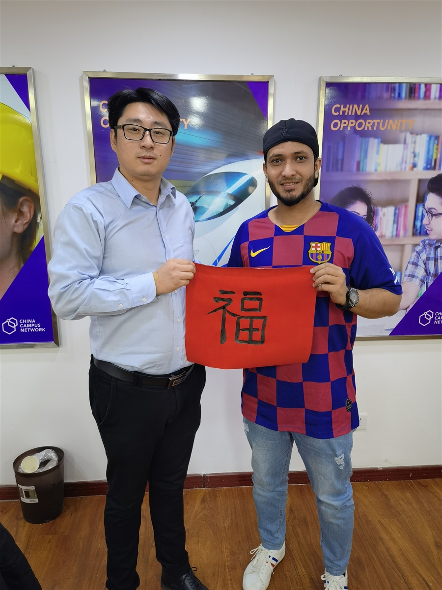 受院长董皓委托,颜副院长代表学院向假期留校留学生送上新春祝福。他表示2020年由于疫情影响,同学们无法与家人团聚,希望留学生同学们把bat365中文官方网站当作自己的家,牛年来临,学院将以人文关怀让留学生感受到“家”的温暖。并预祝所有留学生在牛年里身体健康如牛、学业有成。随后,颜副院长详细地向留学生介绍了“福”字的文化内涵,并由书法老师现场指导留学生写“福”字,书春联。书毕,同学们 纷纷兴奋地展示自己的书法作品,并与颜副院长合影。