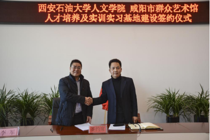 1月19日上午,人文学院党委书记余小勇与咸阳市群众艺术馆馆长李军在咸阳市群众艺术馆签署了“人才培养及实训实习基地建设框架协议”、举行了共建实习基地签约挂牌仪式,并就后续合作、共同推进各自领域发展进行交流。人文学院副院长方松林、设计系主任曹盼宫、咸阳市群众艺术馆副馆长刘英、副书记任小娟等出席签约仪式。