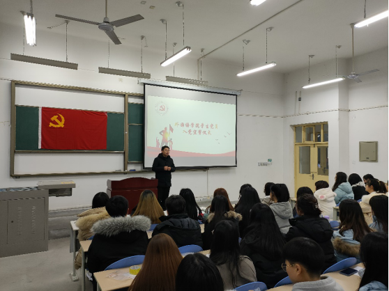 12月30日晚,外国语学院在B区104教室举行新发展预备党员入党宣誓暨党员重温入党誓词活动。学院党委副书记王业青,全体新发展预备党员和部分正式党员参加,仪式由专职组织员岳頔主持。