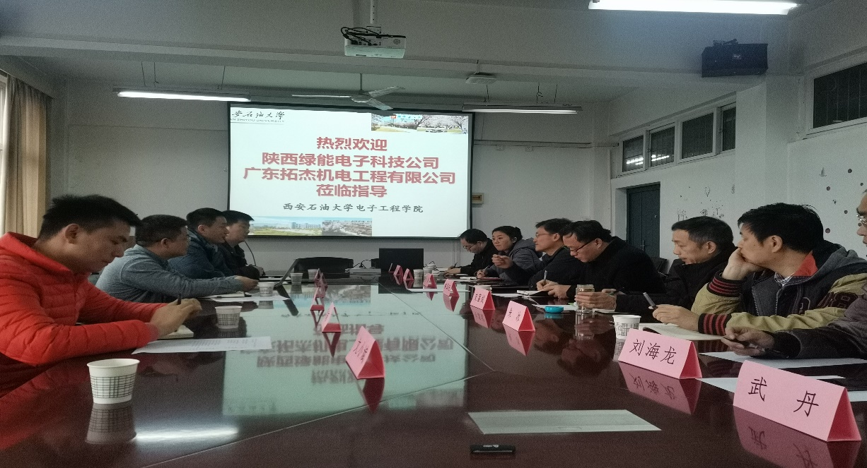 12月7日上午,广东拓杰机电工程有限公司总经理潘志杰、陕西绿能电子科技有限公司总经理助理赵青、副总经理李贵虎等领导一行来我院开展技术交流与合作洽谈,长庆工程设计有限公司电仪信工程设计部副主任李化龙高级工程师陪同来访,交流会在1号教学楼905会议室举行。学院党委书记何铖、副书记毕轶慧、副院长高国旺及自动化教、电气工程及其自动化、安全工程等相关专业的教师参加了交流座谈,学院副院长高国旺主持交流会。