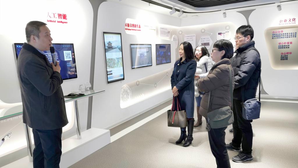 首先参观了公司及展厅,公司副总经理张欣晨向我院介绍了公司的历史沿革和技术研发情况,重点介绍了语音识别与机器翻译结合技术,向大家展示了公司的发展成就及“译见•大数据平台”、数据可视化分析平台、语言盒子•智能会议解决方案等最新科技成果。