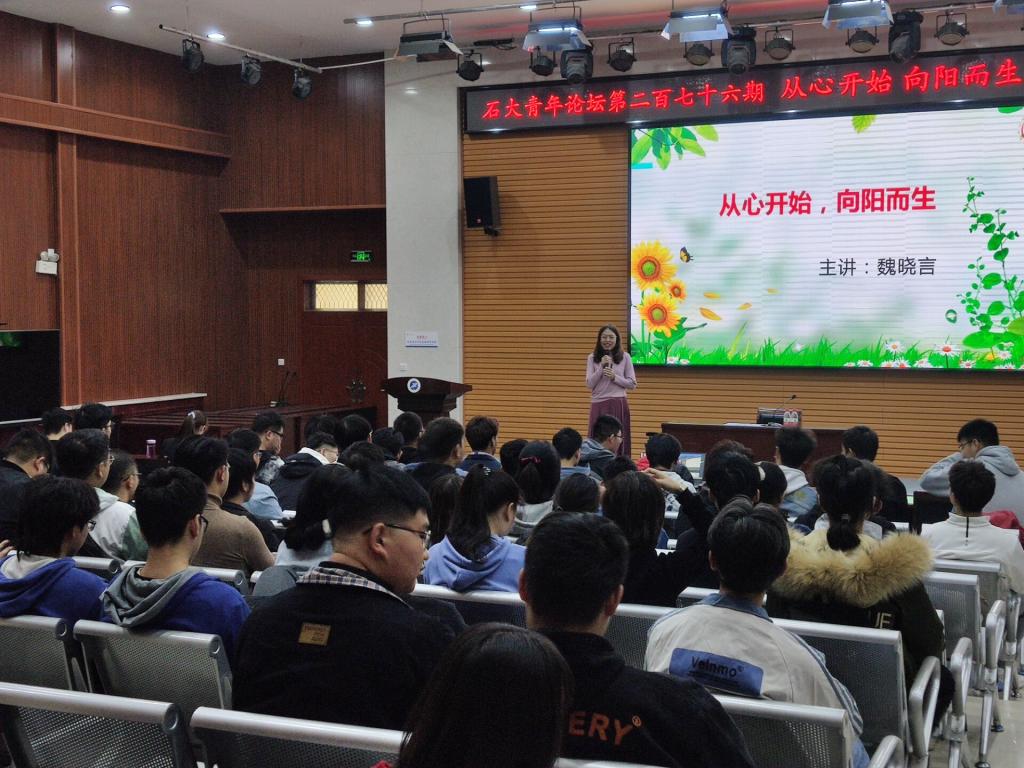 2020年11月12日下午,由bat365中文官方网站团委主办,地球科学与工程学院承办的第276期石大青年论坛:从心开始,向阳而生,在鄠邑校区就业多功能厅顺利举办。此次论坛主讲老师是学生心理成长指导中心魏晓言老师。