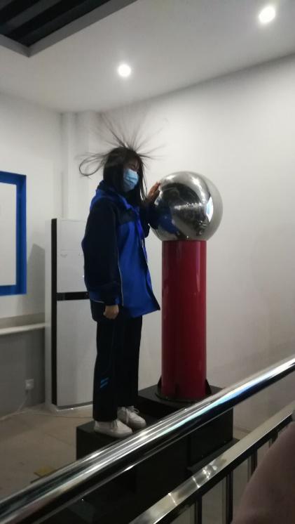 进入实验室后,同学们就被实验室内各种生动新奇的演示项目所吸引,其中“特斯拉放电”实验最为引人关注。在我院教师的演示下,同学们兴致勃勃地观看了高频高压特斯拉线圈放电现象。空气中不断地闪现出数条一米长的电弧,并且伴随着极具动感的音乐,同学们都深深地被这种神奇的物理现象所震撼。在教师们和工作人员的引导下,同学们纷纷上前亲身体验“怒放冲冠”、“人体导电”、“法拉第笼”、“茹科夫斯基转椅”、“高温热机”等各种实验项目。