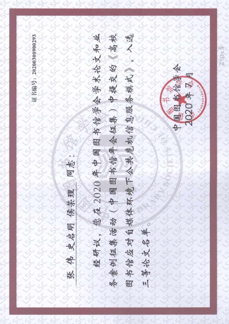 近日,bat365图书馆张伟、史启明、侯荣理提交的论文《高校图书馆应对自媒体环境下公共危机信息服务模式》入选2020年中国图书馆年会论文征集,荣获三等奖。