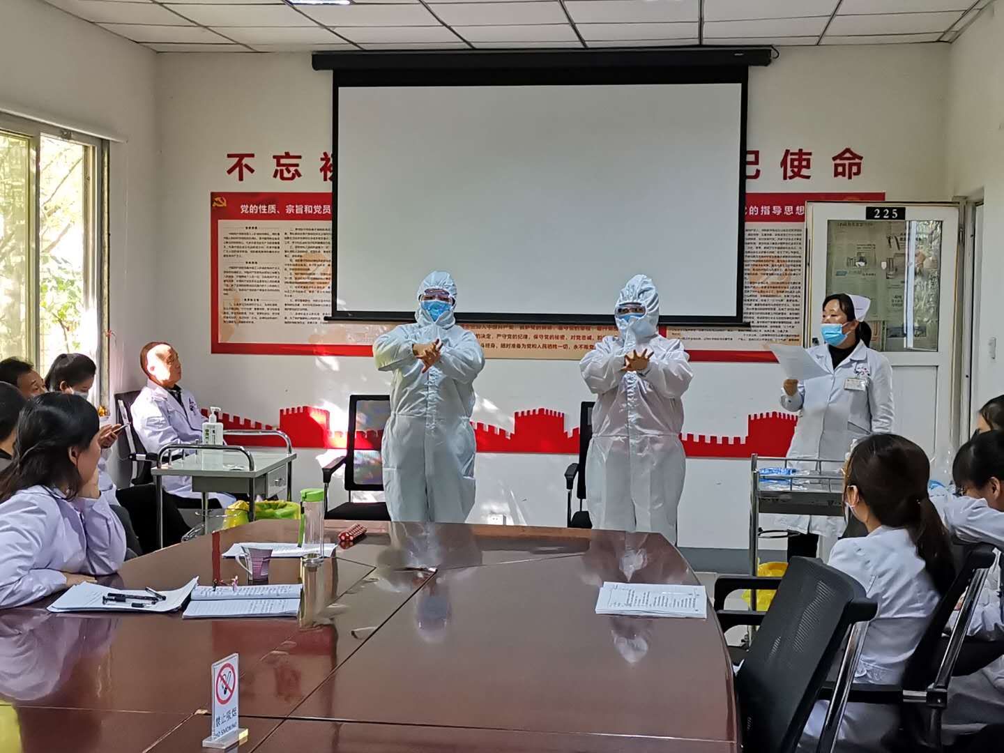 一、传达会议精神和理论知识培训,李明珠副院长传达了10月20日晚上雁塔区卫健局召开的关于《进一步加强全市医疗机构医院感染防控工作》会议精神和讲解了有关新冠肺炎诊疗方案(试行第八版)。崔广志院长根据会议要求,强调了医院感染管理地重要性,认真落实“九个一律”,安排部署好秋冬季疫情防控工作,特别强调了“九个一律”是红线、是底线,任何工作人员不得逾越!院感负责人伍晓燕讲解了医院的感染防护要求和标准,再次讲解了消毒液的配制要求和医疗废物的正确收集、处理。