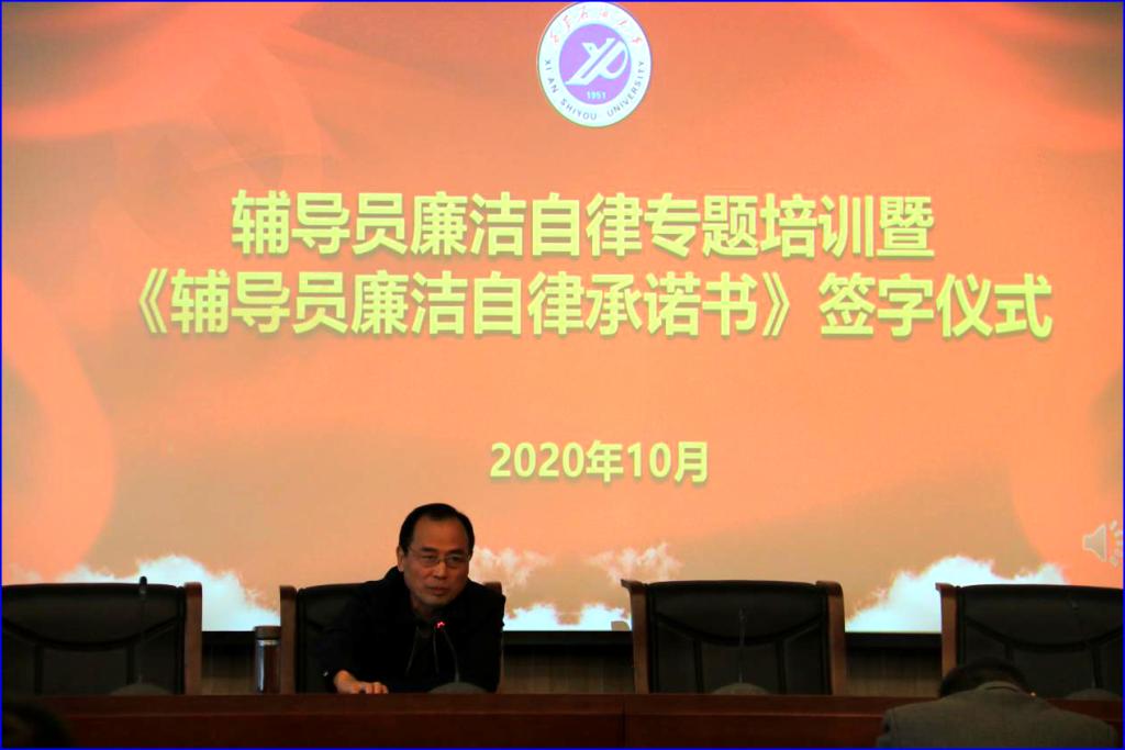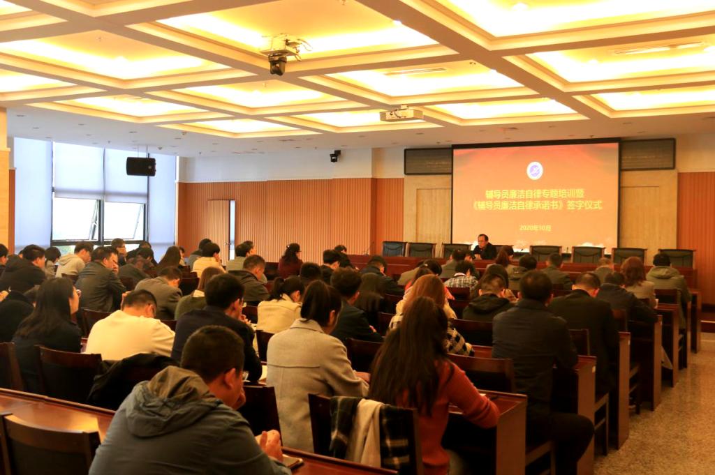 10月21日上午9:30,学生工作部在鄠邑校区图书馆第一会议室召开辅导员廉洁自律专题培训暨《辅导员廉洁自律承诺书》签字仪式。校纪委副书记、监察处处长赵承胜受邀作了廉洁自律专题培训,学生工作部、研究生工作部工作人员,全体专职辅导员、本科生兼职辅导员和部分研究生兼职辅导员共90余人参加了培训会。会议由学生工作部部长赵健主持。