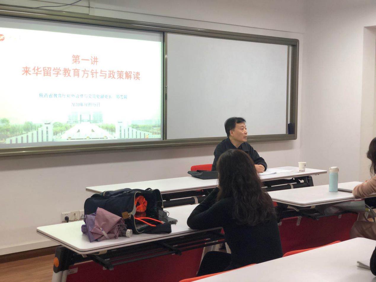 郭宏毅副处长以“来华留学教育方针与政策解读”为题,从我国来华留学生发展过程及陕西省来华留学生发展现状、陕西省来华留学生管理工作及取得的成绩、留管干部工作建议及要求、今后来华留学生发展工作重点四个方面为主题,深入浅出,系统讲解了来华留学生管理工作中的各项政策。此外,郭宏毅副处长结合实际案例,重点讲解了突发事件处理、舆情管理、来华留学签证审批表(JW202表)管理、如何实现提质增效等管理过程中的突出问题。
