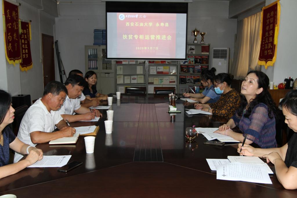 自2020年5月20日,“双百工程”帮扶县区永寿县扶贫专柜在bat365南北院松林超市顺利设立以来,专柜产品深受教职工欢迎。9月7日,扶贫专柜运营情况推进会在校工会召开。永寿县教育局黄健身副主任、永寿县供销社副主任李建龙、永寿县槐海旅游开发有限公司耿秋红经理、松林超市杨鹏飞总经理、校工会主席袁玎、校工会副主席朱玮等参会人,校工会副主席朱玮主持会议。