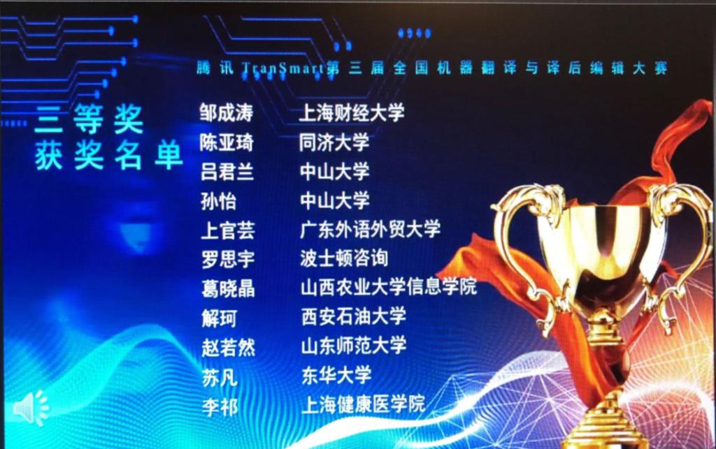 “腾讯TranSmart第三届全国机器翻译与译后编辑大赛”的复赛于2020年7月4日在Tmxmall的官网平台举行,共有来自全国37多所高校超过4200名选手参赛。外国语学院于艳英、李娜老师获得优秀指导教师奖,同时2018级翻译硕士研究生解珂同学获得三等奖的好成绩。