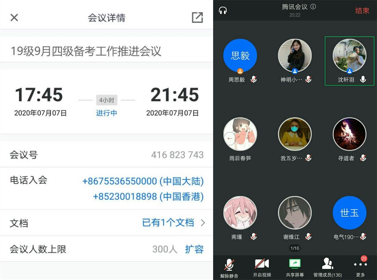 为做好我院四六级备考工作,提升我院19级四六级通过率,7月7日18:00电子工程学院19级辅导员沈轩羽老师通过腾讯会议APP主持线上19级9月四级备考工作推进会,会议就已开展为期一个多月的四六级备考工作进行交流和总结。