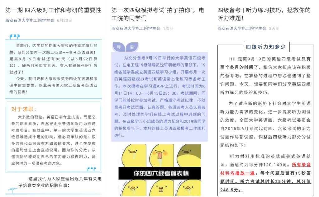 推送工作的主要工作内容为定期在学院微信公众号和易班撰写并推送四级备考相关的主题推送文。英语四级学习小组已在6月通过电子工程学院微信公众号平台和易班平台推送四级的重要性、听力题型分析及技巧和六月份模考情况三篇文章。推送的意义在于与同学们分享四级备考经验技巧,共同努力,共同进步帮助大家度过备考期。