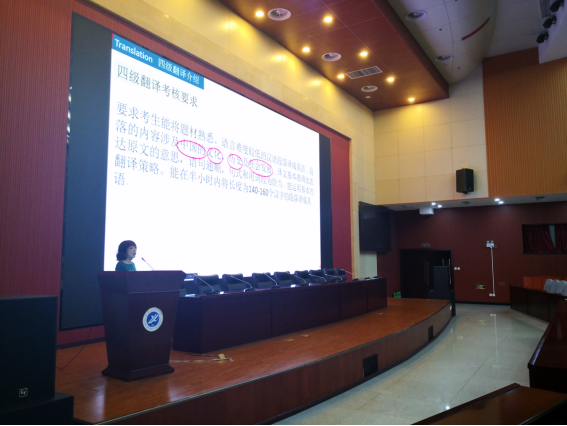 五场四级讲座由外国语学院大学英语四级教学研究团队教师主讲,分别为武绒老师主讲的“大学英语四级考试备考策略”、拓葳老师主讲的“大学英语四级听力专题”,周亮老师主讲的“CET-4考试写作题型分析及破题思路”,蔡利老师主讲的“大学英语四级考试选词填空及长篇阅读答题技巧”及沈舒方老师主讲的“大学英语四级翻译专项”。主讲教师就词汇记忆、四级听力与写作的试题特点与应试策略、四级阅读的出题特点与应试技巧及四级翻译的命题特点和答题技巧进行了全面而又细致的讲解。