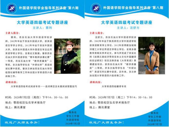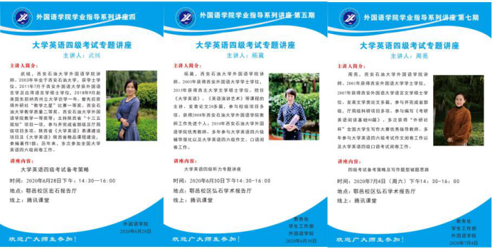 为了让我校学生全面了解大学英语四级考试,提升大学英语四级通过率,在教务处和学生工作部的支持下,外国语学院于6月29日至7月7日分别举办五场大学英语四级讲座。此次讲座面向全校学生,以线上和线下两种方式进行,线下主会场设在鄠邑校区弘石学术报告厅,分会场设在各四级强化辅导班教室,线上使用腾讯课堂直播,截至目前为止bat365共有5342名同学通过线上线下方式参加了此次系列讲座。