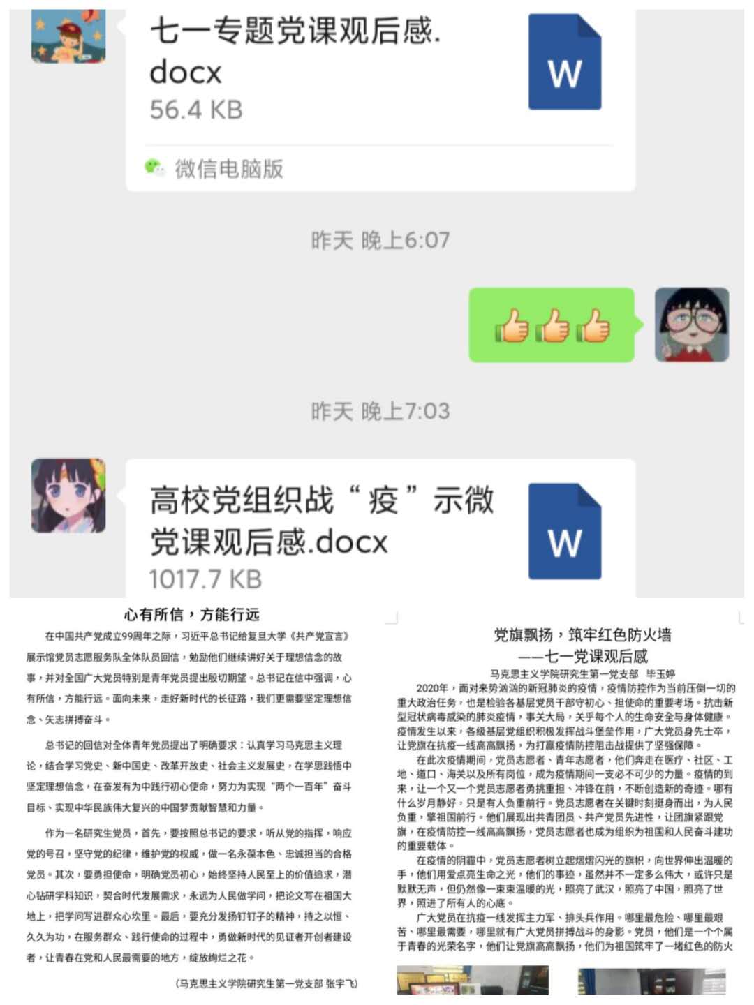 为庆祝中国共产党建党99周年,7月1日上午9点,由教育部思政司指导的高校党组织战“疫”示范微党课“七一”专题在线上开播,马克思主义学院党总支、各党支部组织全体师生党员通过线上、线下等多种方式及时收看。学院党总支委员、教师党员代表、毕业生党员代表,在党员活动室集中收看了此次党课直播。