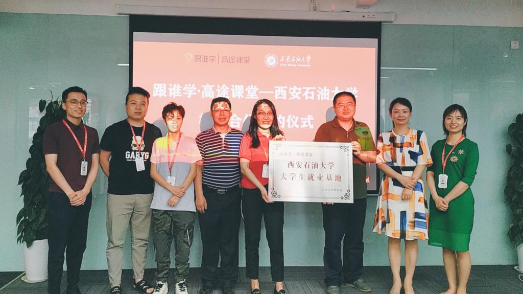 跟谁学•高途课堂西安公司宋思捷、校友代表与bat365经济管理学院学生管理办公室主任刘冰、2016级辅导员武威,人文学院学生管理办公室主任付强,外国语学院2017级辅导员陶李参加了就业基地签字仪式。
