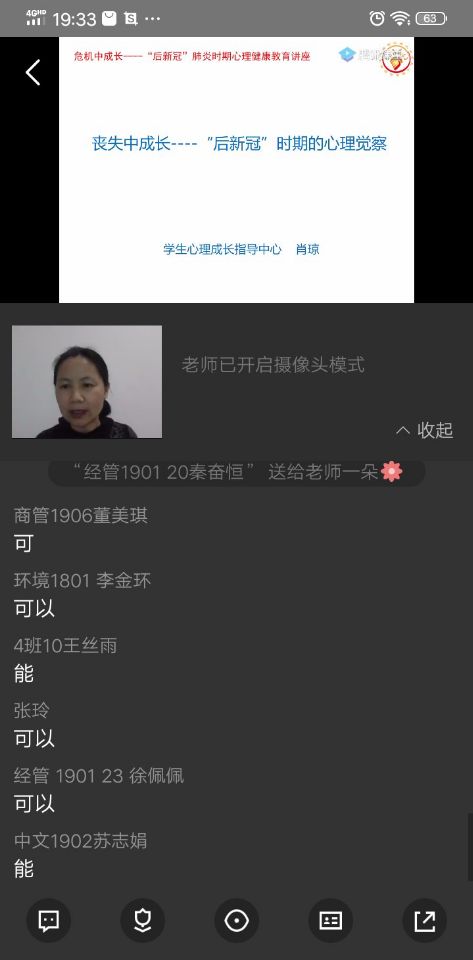 肖老师讲到,新冠肺炎严重暴发期间,人们的注意力在疾病本身,而“后新冠”肺炎时期的当下,人们更关注新冠肺炎造成的影响,尤其是心理影响。她以“新冠肺炎”疫情中的丧失为切入点,让同学们回顾疫情期间的情感、行为及关系,体会在疫情期间丧失了什么,又引导同学们辩证地思考丧失中是否只有失去,在学生们总结出抗“疫”期间的收获后,启发同学们觉察新冠肺炎疫情带给自己的成长。