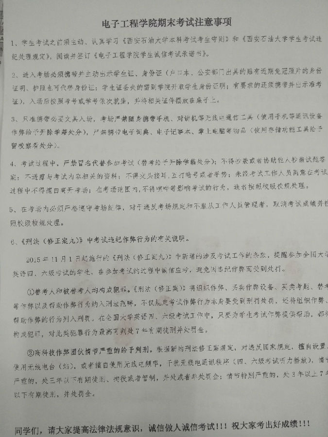 为深入贯彻学校及学院关于加强学生诚信守纪教育要求,提高大学生的诚信应考意识,营造诚信考试之风,2019年11月至2020年1月,电子工程学院在全国大学英语四六级考试和期末考试期间,通过各种形式扎实开展诚实守信主题教育活动,扎实推进本科生及研究生诚信考试教育工作。