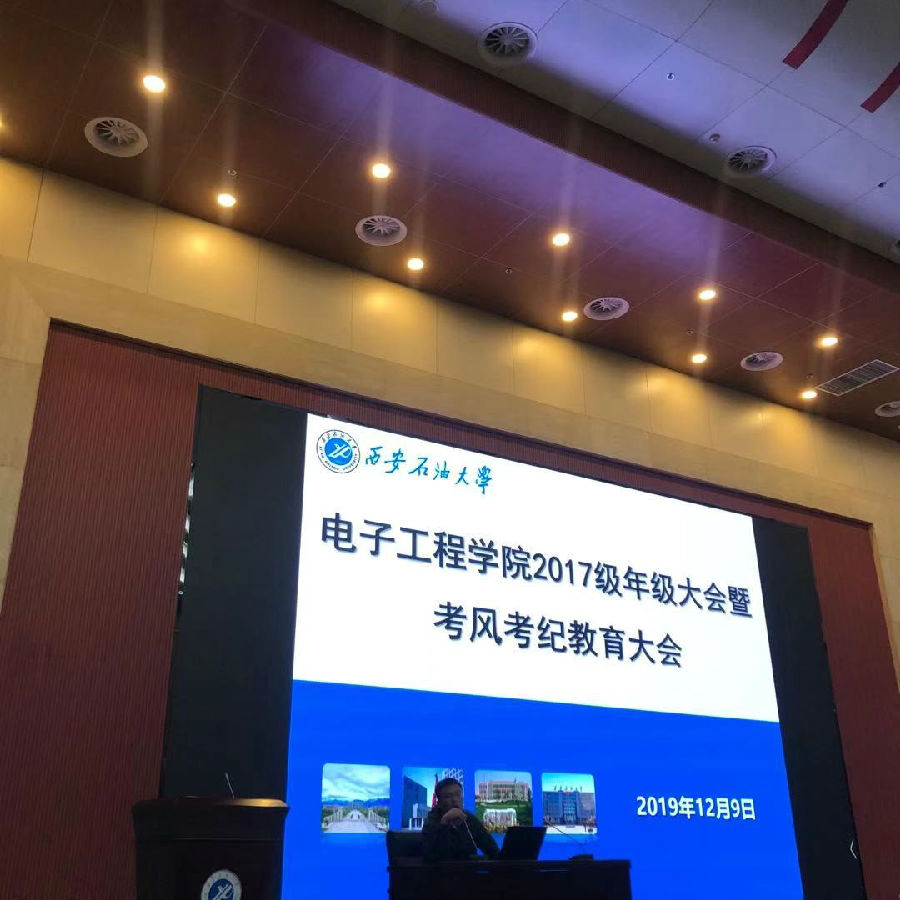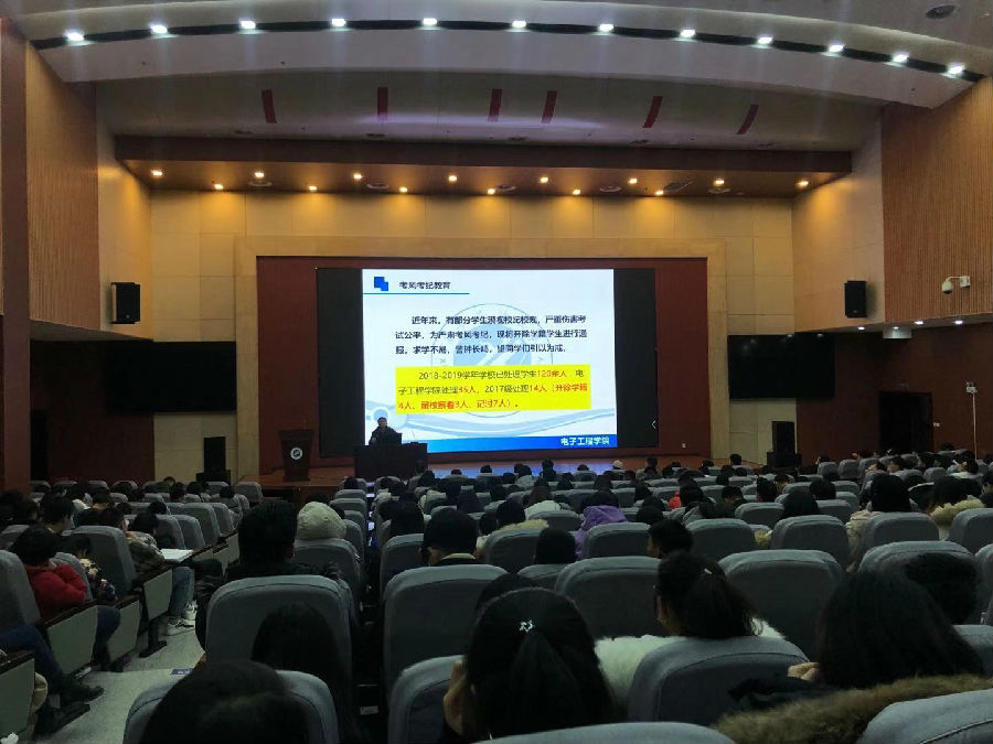12月9日晚七点,电子工程学院2017级年级大会暨考风考纪教育大会在鄠邑校区弘石学术报告厅召开,会议由电子工程学院2017级辅导员高建邦老师主持,学院全体2017级学生参加了本次大会。大会内容从学生现阶段的学习和生活实际出发, 主要从“身心健康教育”、“考风考纪教育”、“安全教育”“奖助学金工作汇报”“专业学习及毕业选择”等内容展开。