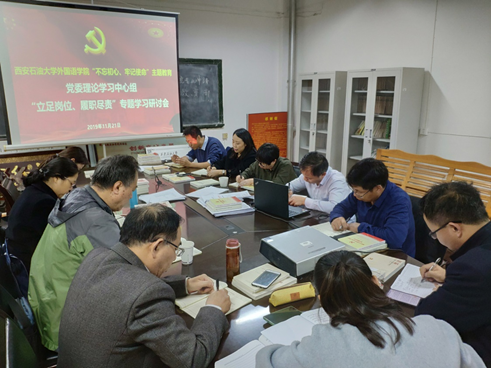 11月21日下午,外国语学院党委理论学习中心组在雁塔校区1号教学主楼701会议室召开“立足岗位、履职尽责”专题学习研讨会。学院党政领导班子、理论中心组成员、教工党支部书记参加了会议,会议由学院党委书记蔡强主持。