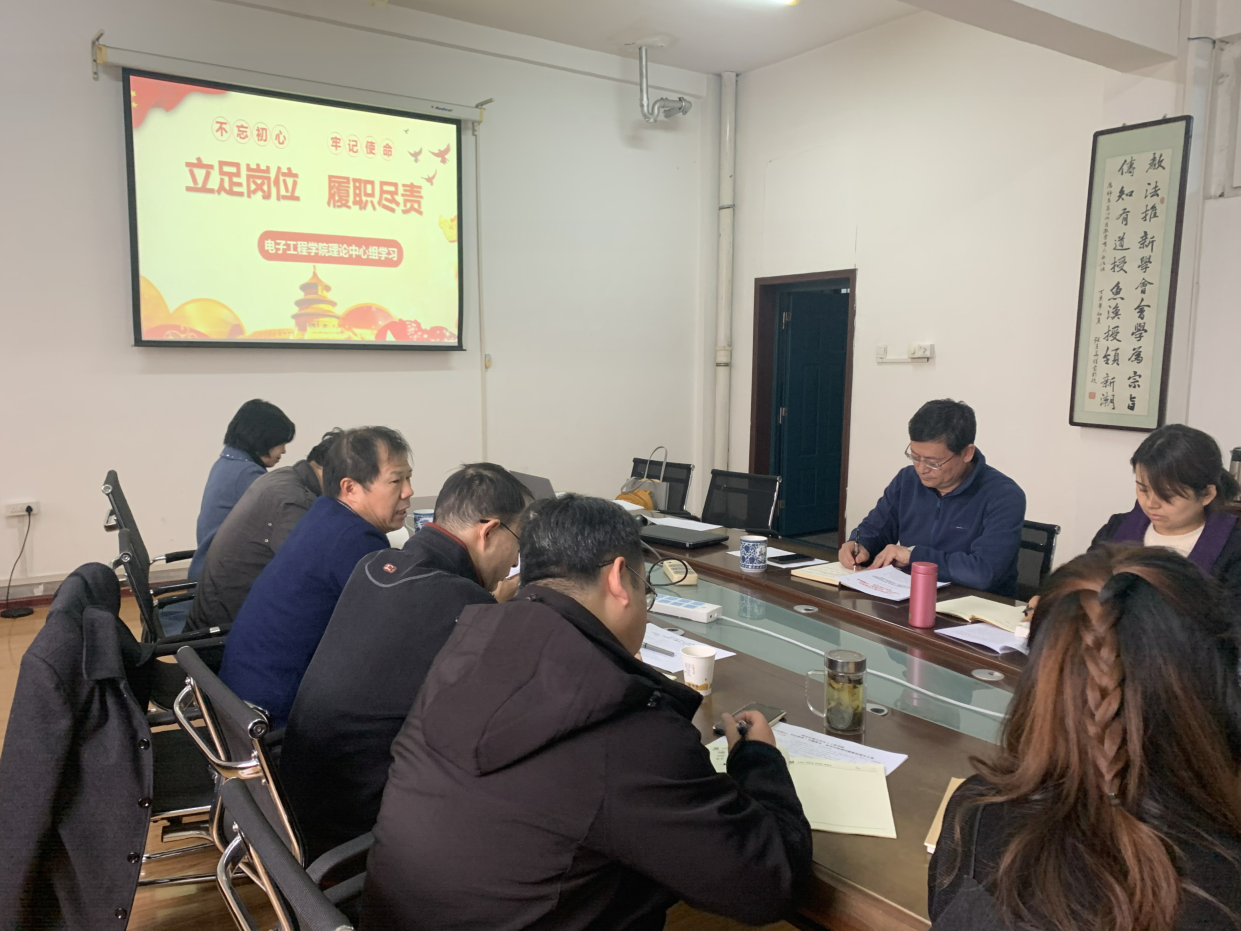 11月20日下午,电子工程学院党委“不忘初心、牢记使命”主题教育学习教育第六个专题“立足岗位、履职尽责”专题学习暨十一月学习研讨在1号教学楼908会议室举行,会议由学院党委书记何铖同志主持,院党委委员、理论中心组成员、各教工党支部书记、教研室主任参加了会议。