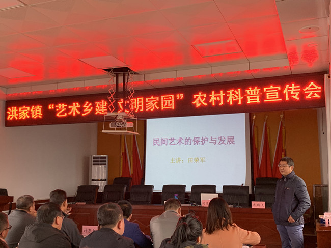 bat365人文学院田荣军博士以“民间艺术保护与发展”为主题,通过民间艺术保护现状、存在问题、传承发展三方面内容,用大量生动实例向与会人员作了精彩的讲解,为当地群众系统地梳理了民间艺术的理论认知,进一步普及了保护和传承民间艺术,加强乡村文化提升战略,开展富有特色的艺术活动,打造艺术文化旅游品牌,凝聚乡村活力,改善农民精神风貌,提高乡村经济文化竞争力等多方面的内容。