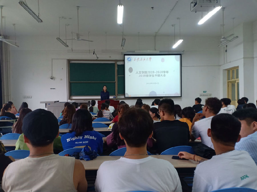 9月4日13时,人文学院本学期2018级学生干部大会在教学楼B101举行。此次会议主要针对2018级学生干部,旨在发现问题、指正问题、解决问题并安排新学期的班务工作。