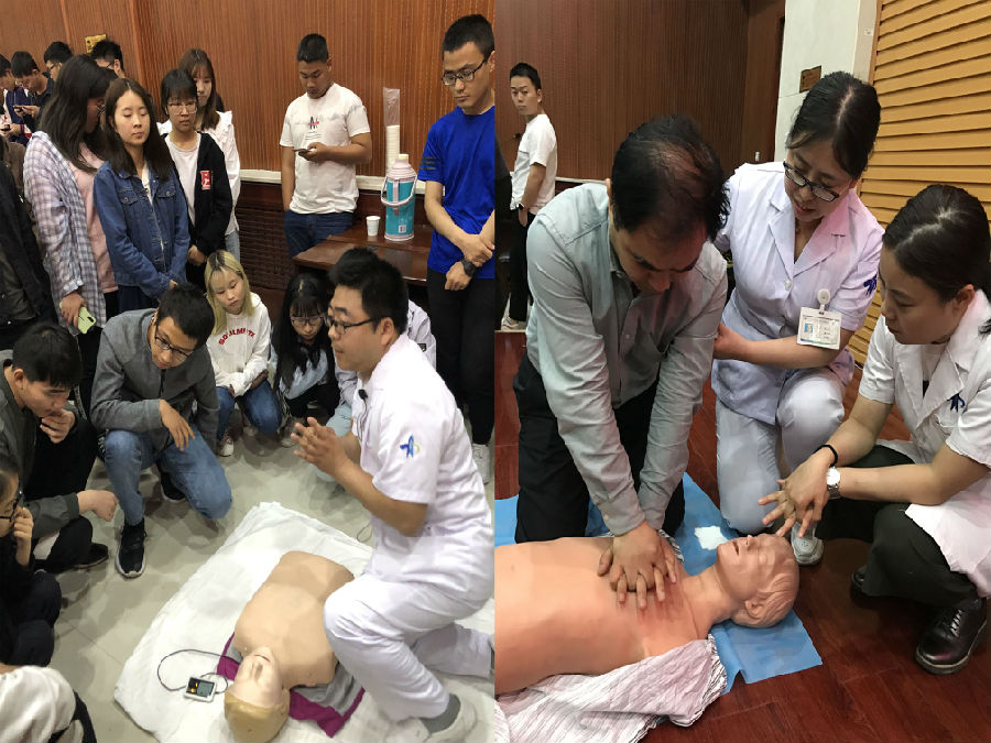 西安交大一附院重症医学科郭秦乐博士,住院医师,通过PPT的形式引用生活中的实例,为参加培训的人员进行急救知识理论培训,从如何正确判断病人心跳、呼吸骤停及实施抢救的BLS流程,对抢救的每一个环节进行了细致阐述,同时讲解了心肺复苏过程中的注意事项及抢救成功的指标。理论培训结束后,设立了有奖互动抢答环节,同学们积极踊跃的参与,加深了对理论知识的记忆。现场操作培训分为四组,培训老师对心肺复苏呼-叫-C-A-B操作的各个步骤进行演示,并耐心指导每一位同学操作练习,确保每一个急救步骤的正确性。