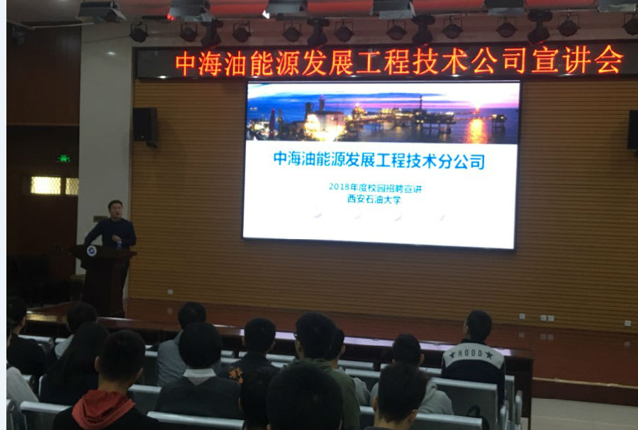 2018年10月16日上午,地球科学与工程学院在鄠邑校区就业指导中心多功能厅举办中海油能源发展工程技术分公司专场招聘会,公司人事经理刘作鹏一行五人出席招聘会,bat365100余名毕业生参加招聘会。