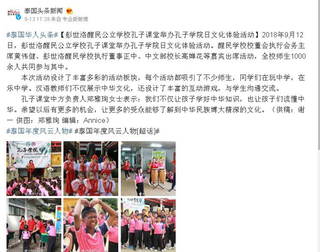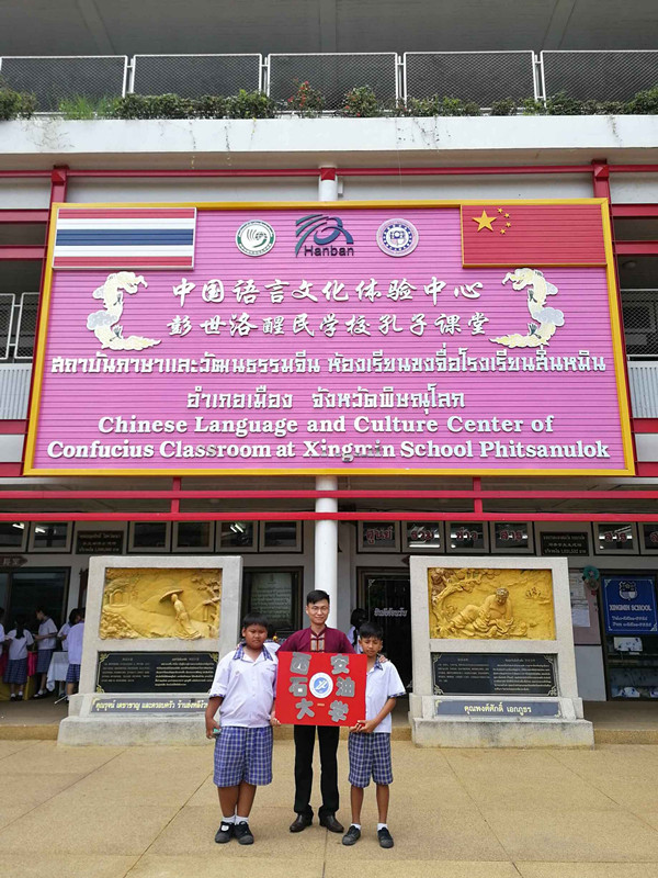 近日,人文学院汉语国际教育专业17级研究生在泰国醒民学校孔子课堂举办了孔子学院日活动。这是由并国家汉办、孔子学院发起,世界各地孔院同时举办,为纪念孔子学院建设发展的重要庆祝活动,其目的是宣扬中华文化,推广汉语教育。此次活动被泰国华人头条网报道,受到了当地校领导和学生们的一致认可和高度评价。