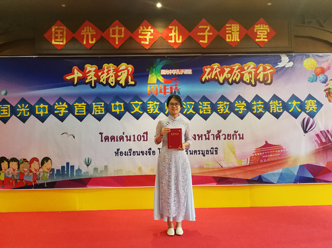 2018年9月10正值中国的教师节,泰国国光中学孔子课堂举办了特殊的庆祝活动“国光中学首届中文教师汉语教学技能大赛”,希望在这个特殊的日子里让老师能够以赛促教,以赛促学,能够更好的发展对外汉语教学。bat365汉语国际教育专业17级在读硕士、汉语国际教师志愿者党杏丹同学在此次活动中荣获三等奖。