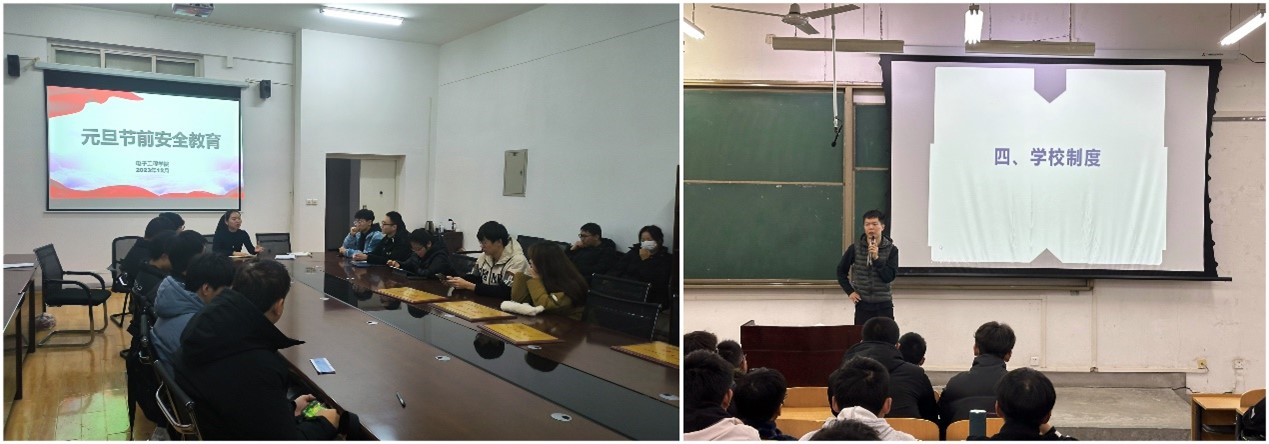 为提高学生在元旦节假日期间的安全意识,确保学生度过平安和谐的元旦小长假,根据学院关于2024年元旦假期学生安全教育相关工作安排,电子工程学院各年级辅导员结合 “四进两联一交友”学生管理模式,于2023年12月下旬开展元旦节前安全主题教育工作。