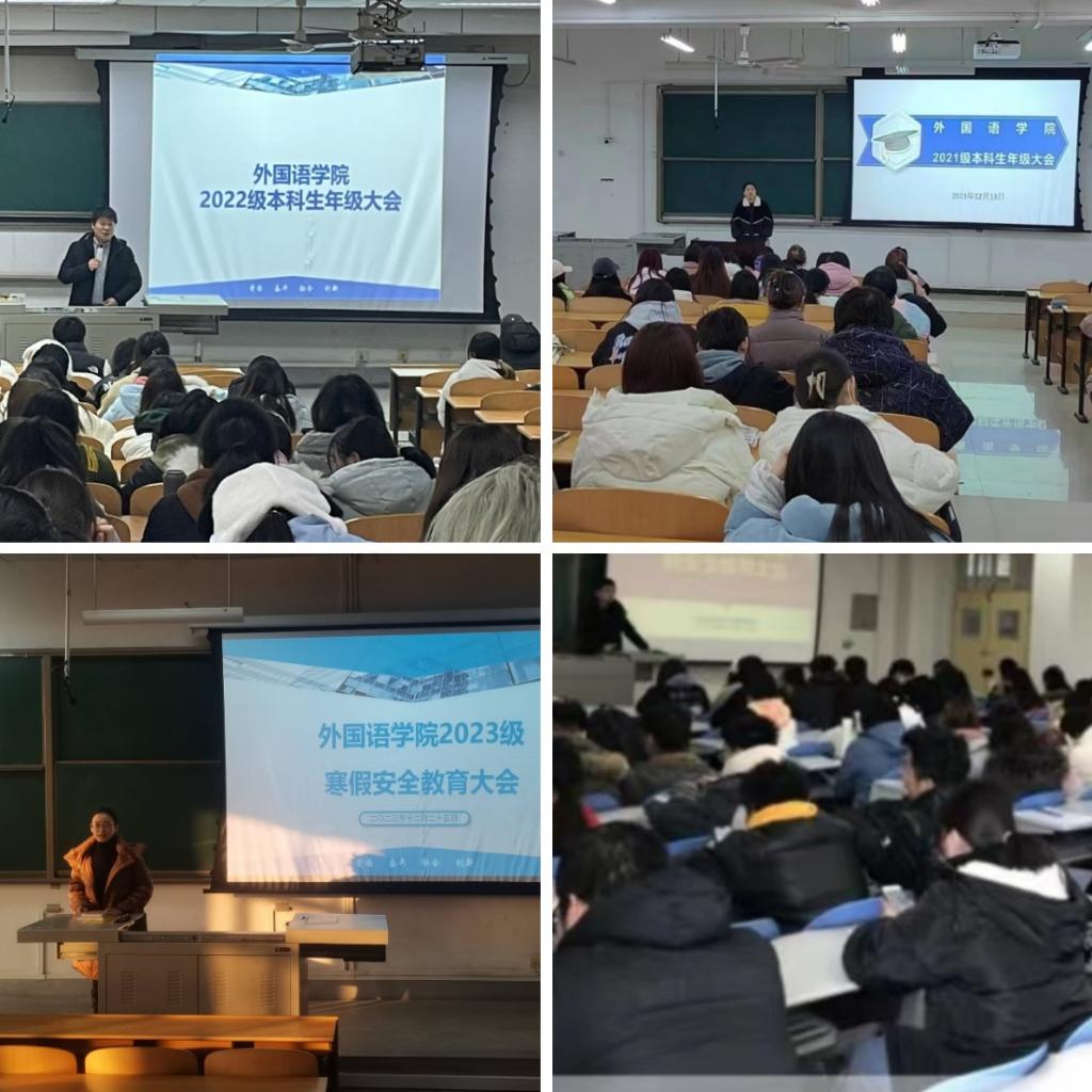为进一步增强学生安全防范意识,切实做好寒假期间学生教育管理工作。近日,外国语学院各年级召开寒假假期安全教育大会。