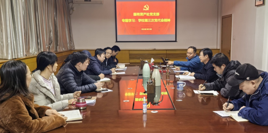 1月12日下午,国资处党支部在行政楼二楼会议室召开学校第三次党代会报告专题学习会。副校长苏文甫参会并作交流发言。支部全体党员及全处职工参会。会议由支部书记侯琦主持。