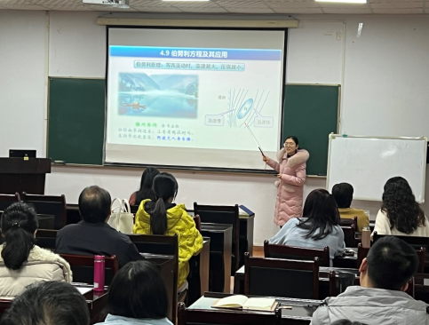 接着,化工机械系老师唐春丽为全体老师讲授“工程流体力学”课程思政示范课。唐春丽将民航事故、工程经验和古诗词融入教学中,通过15分钟“深入浅出”的讲解,将伯努利方程的物理意义完美的呈现在“听众”眼前。唐老师精湛的授课技艺获得了老师们由衷的赞叹。
