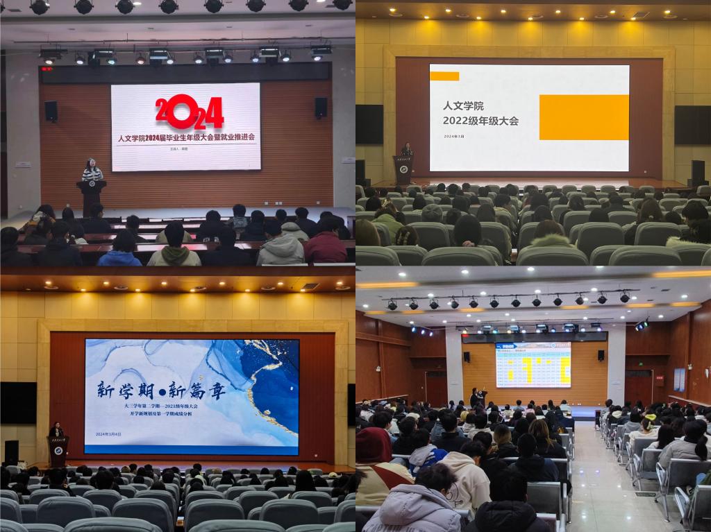 3月4日,人文学院各年级在弘石报告厅、就业指导中心多功能报告厅举办年级大会。会议旨在加强各年级学风建设,提高同学们的学习兴趣及成效,营造良好的就业、学习氛围。会议由各年级辅导员主持,学院全体学生参加。