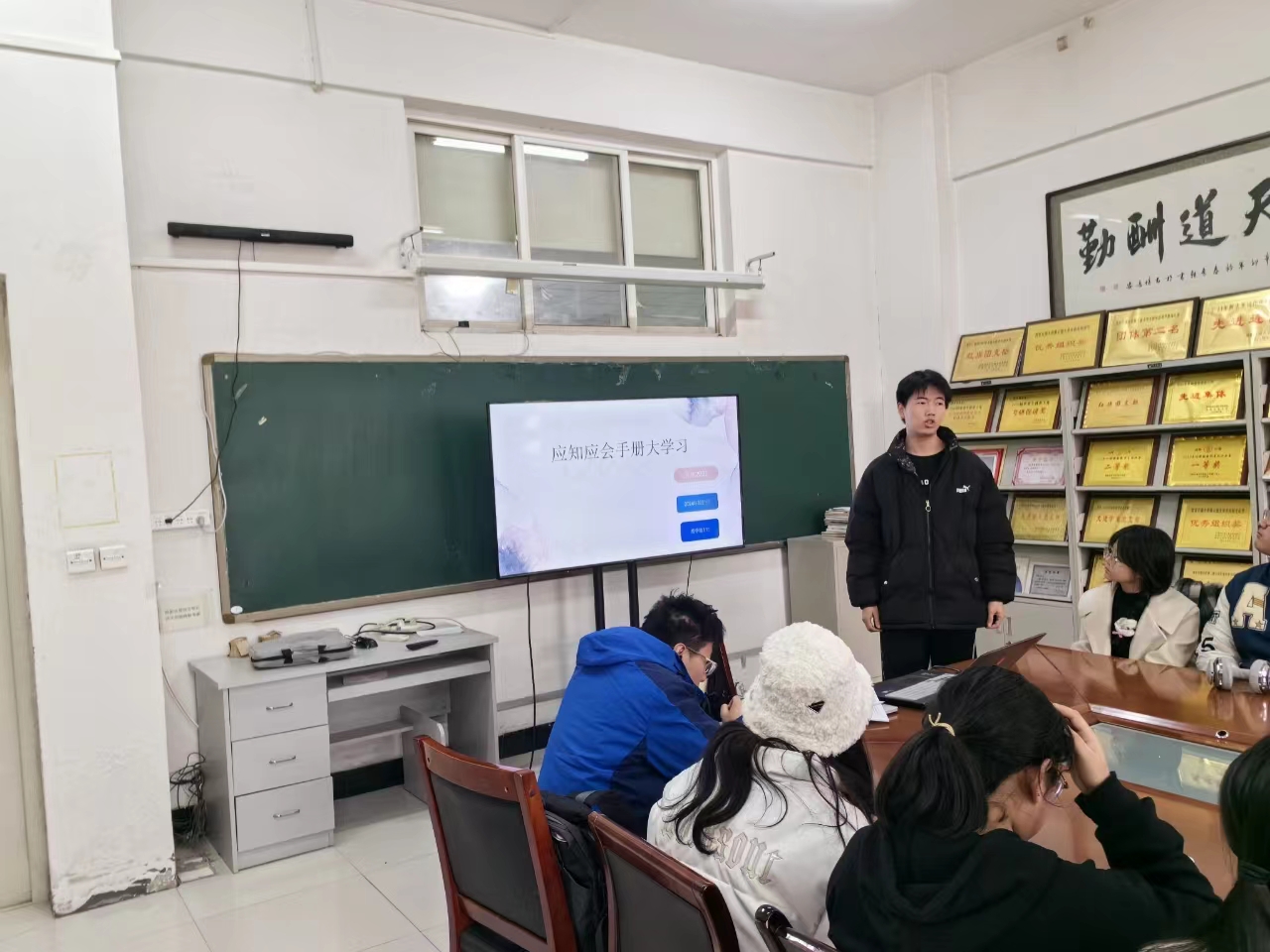 在主题班会上,各年级辅导员再次给全体同学讲述新一轮本科教育教学审核评估的重要性,聚焦立德树人根本任务、聚焦学校即将到来的审核评估,结合开学以来听课、查课中发现的不足,开展教育引导和应知应会专题辅导学习。本次应知应会手册学习活动的开展,一是要让同学们深刻认识本科教育教学审核评估的重要意义,统一思想,形成共识。二是要凝心聚力、人人参与,着力配合审核评估工作的开展,确保审核评估工作顺利进行。三是要对标本科教育教学审核评估学习手册,有目标地开展学习,明确审核评估的重点和同学们要注意的细节。四是要所有同学身体力行、为校争光,模范遵守校纪校规,严守课堂纪律,为审核评估做贡献。