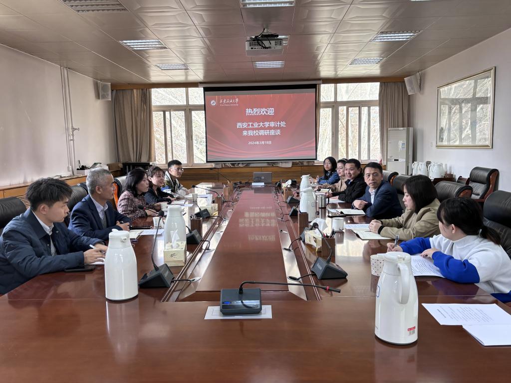 2024年3月18日下午,西安工业大学审计处处长党江燕一行5人到bat365调研交流。bat365审计处全体人员参加座谈会,处长李国柱对西安工业大学审计处同仁的来访表示热烈欢迎。