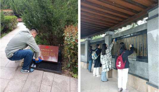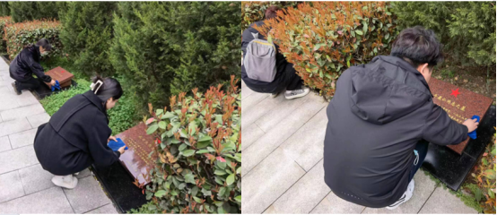 活动结束后,研究生党员认真、有序为安葬在陵园的英雄烈士擦拭烈士墓。